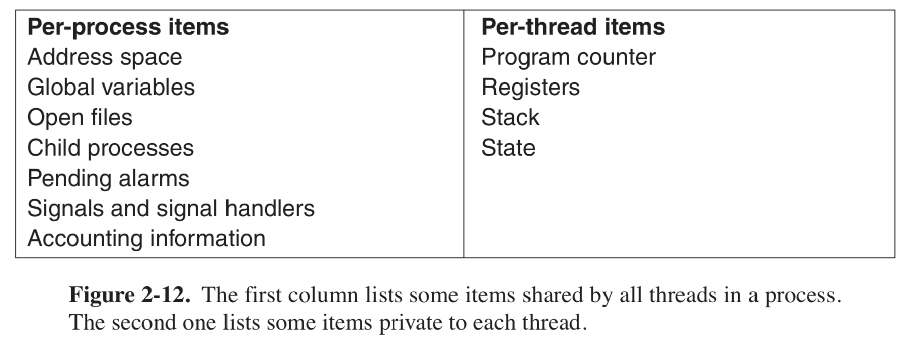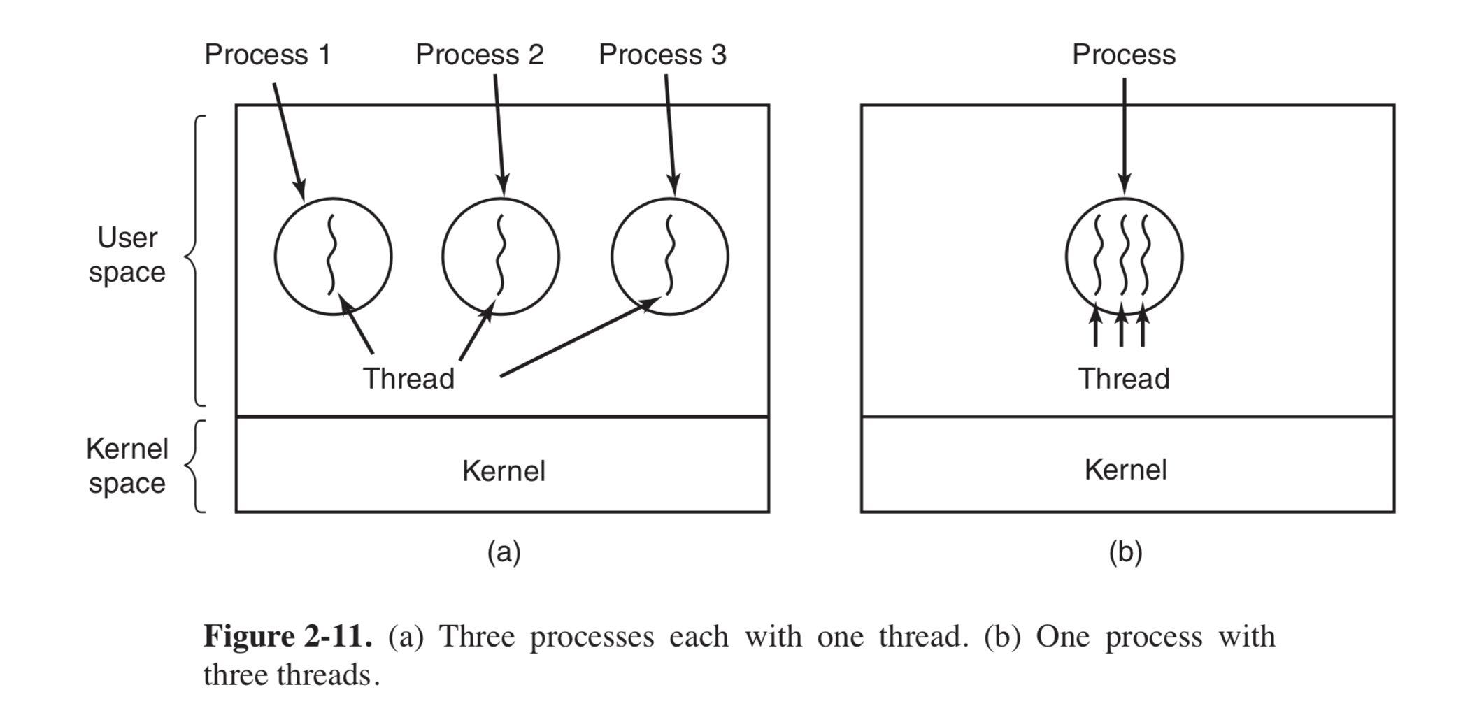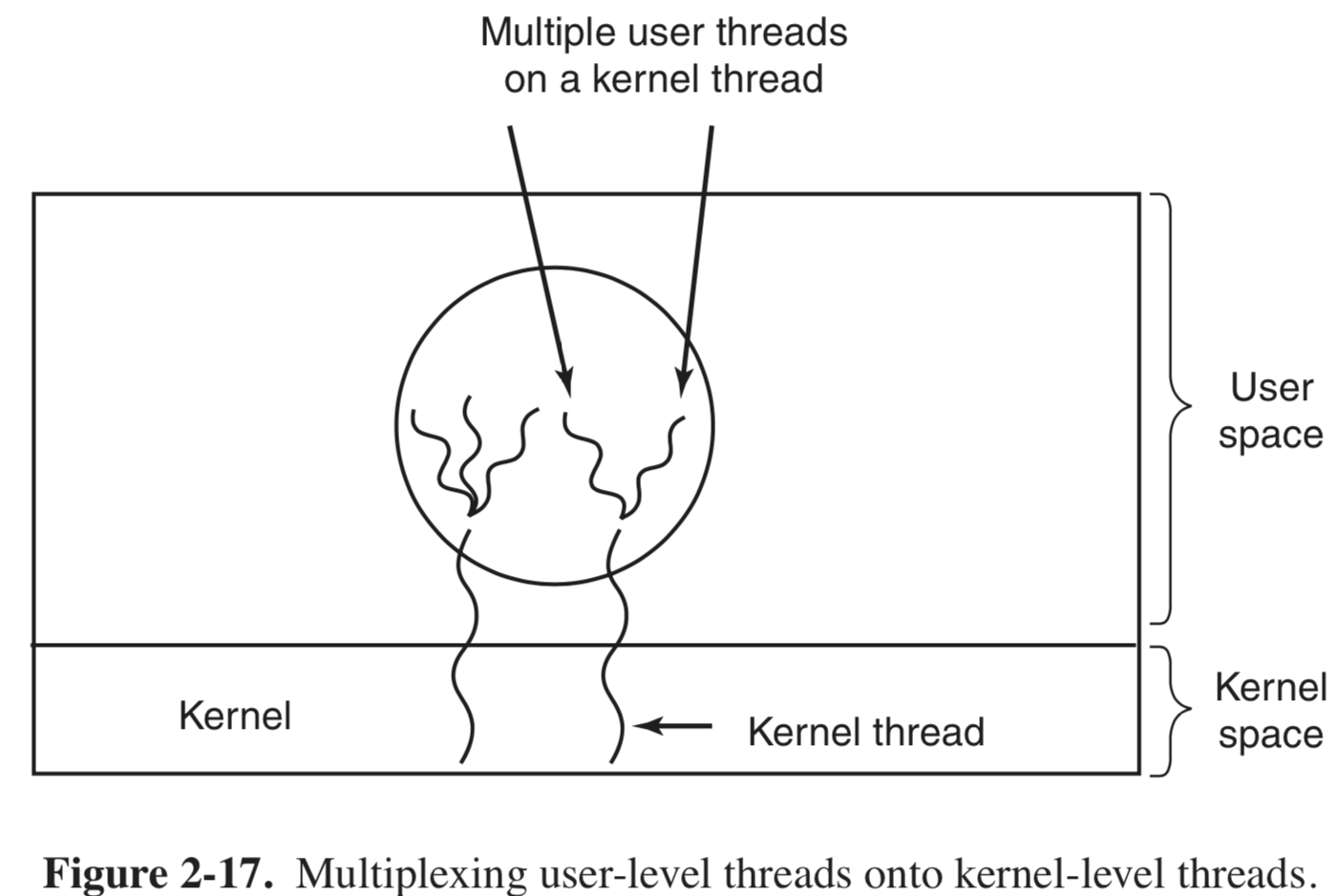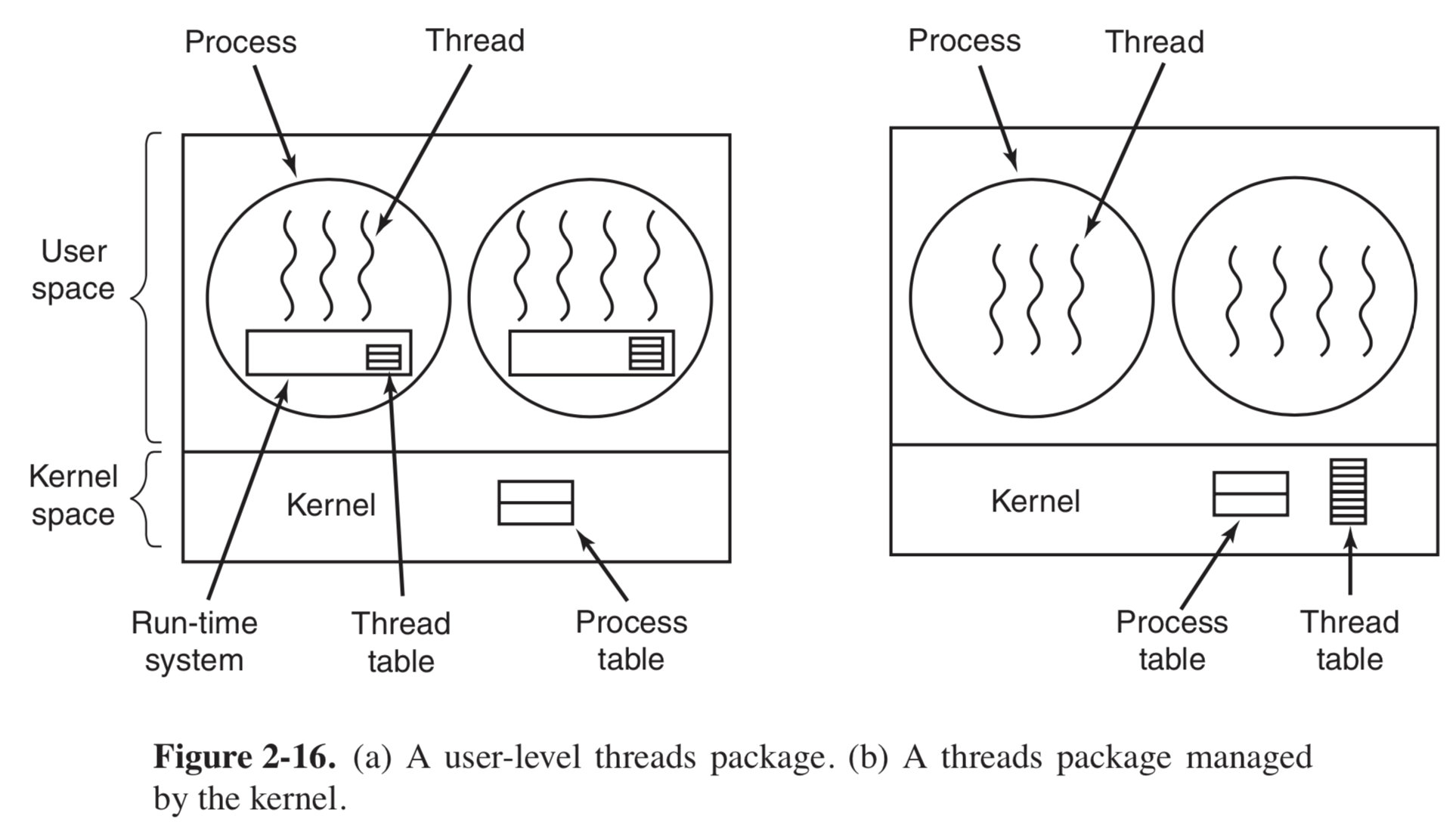 用户空间管理线程如图 2-16(a), 每个进程需要有其专属的的线程表(thread table),用来追踪该进程中的线程。这些线程表和内核中